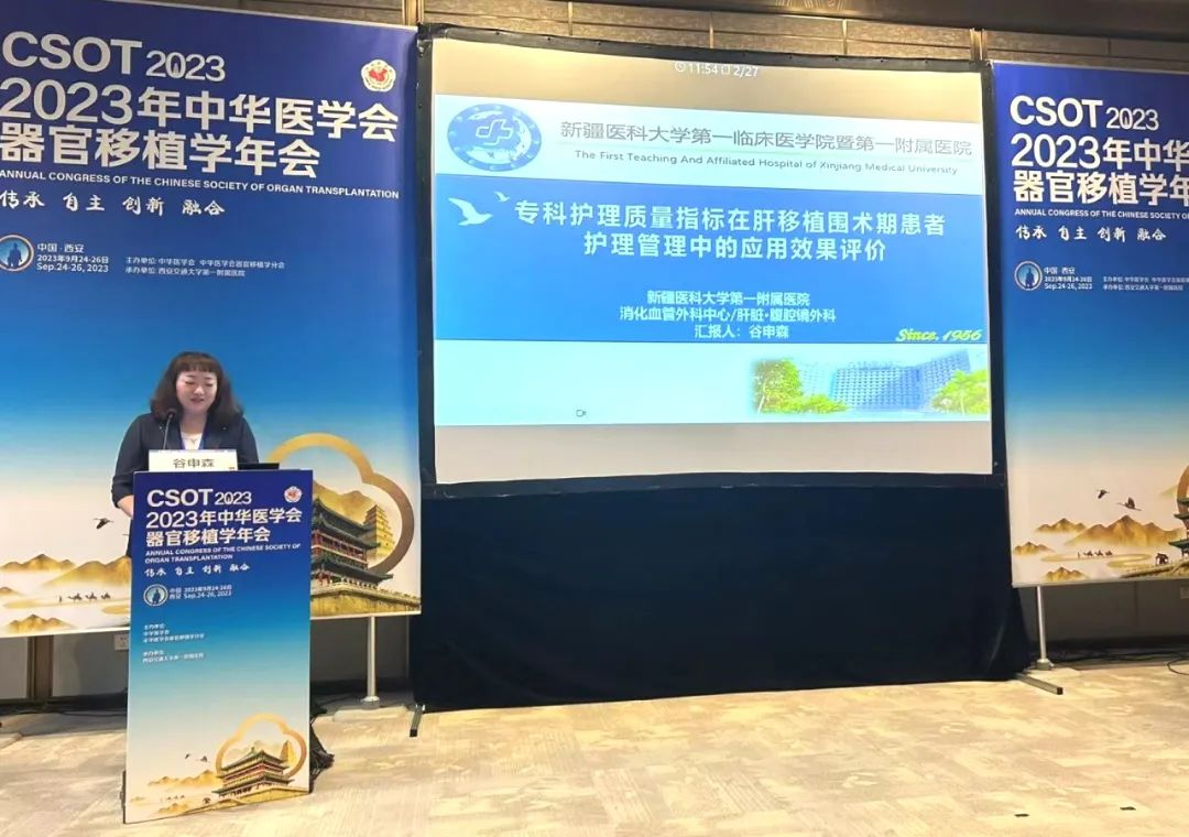 在肝脏移植专题会场,新医大一附院消化血管外科中心主任邵英梅作为第九届中华医学会器官移植学分会委员,受大会邀请担任“肝移植预后与综合管理”会场主持;肝脏·腹腔镜外科吐尔洪江·吐逊主任医师在“肝移植技术创新”分会场作《腹腔镜供肝切取的机遇和挑战:附西北首例》学术演讲;肝脏·腹腔镜外科副主任护师谷申森在移植护理专题作《专科护理质量指标在肝移植围术期患者护理管理中的应用效果评价》专题发言。