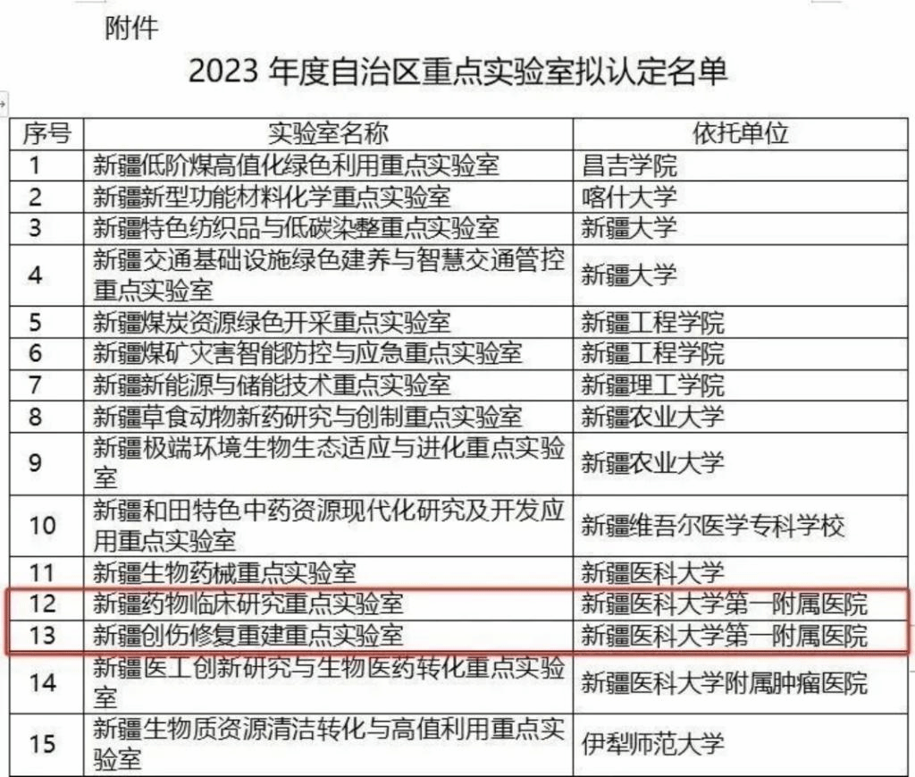 10月16日,自治区科技厅公示2023年度自治区重点实验室拟认定名单,依托新疆医科大学第一附属医院的新疆药物临床研究重点实验室、新疆创伤修复重建重点实验室入选,标志着我院在创新驱动医药领域高质量发展道路上又踏下坚实的脚步。