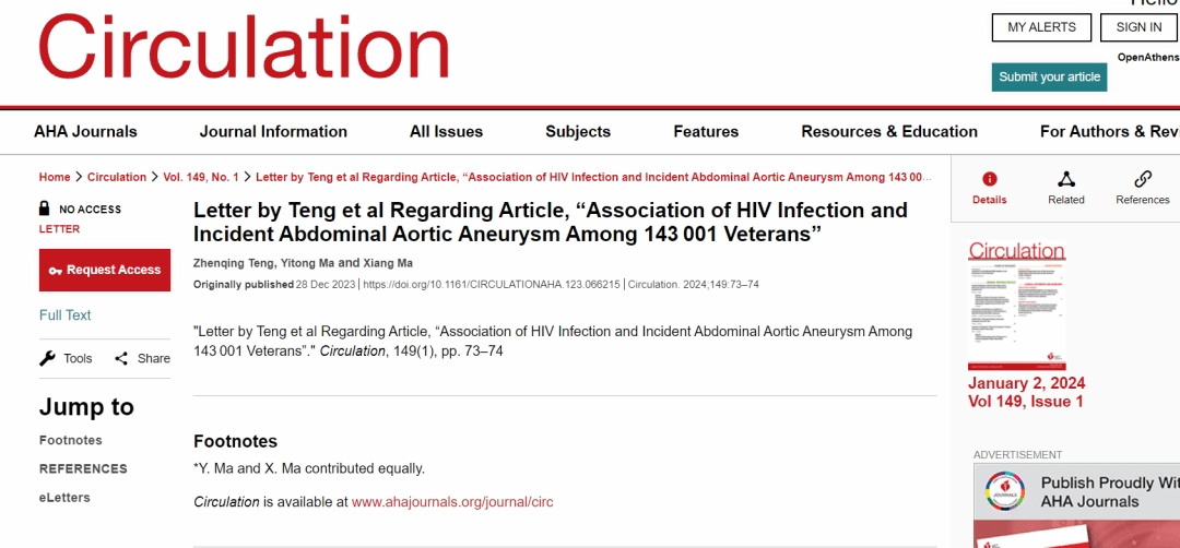 近日,新疆医科大学第一附属医院心血管病中心团队马依彤教授和马翔教授指导的博士生在心血管领域权威期刊《Circulation》第四次发表评论文章 “Letter by Teng et al Regarding Article, ‘Association of HIV Infection and Incident Abdominal Aortic Aneurysm Among 143 001 Veterans’”。