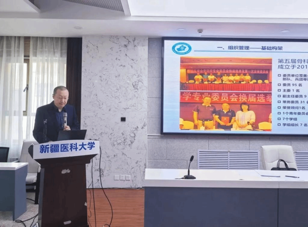 主任委员曹力教授汇报新疆医学会第五届骨科学专业委员会工作情况并作表态发言,在新一届任期内,骨科专委会将遵循全疆医疗卫生事业发展基调,进一步细化规划、强化方法、激发活力,推动新疆骨科学科的高质量发展,在骨科医疗体系建设、骨科学术交流、骨科人才培养、急危重病救治、社会医疗保障等方面发挥重要作用,为新疆医疗卫生事业发展做贡献。