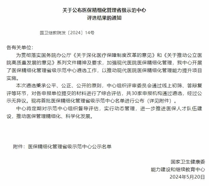 近日,国家卫生健康委能力建设和继续教育中心公布医保精细化管理省级示范中心遴选结果,新医大一附院获评首批医保精细化管理省级示范中心。