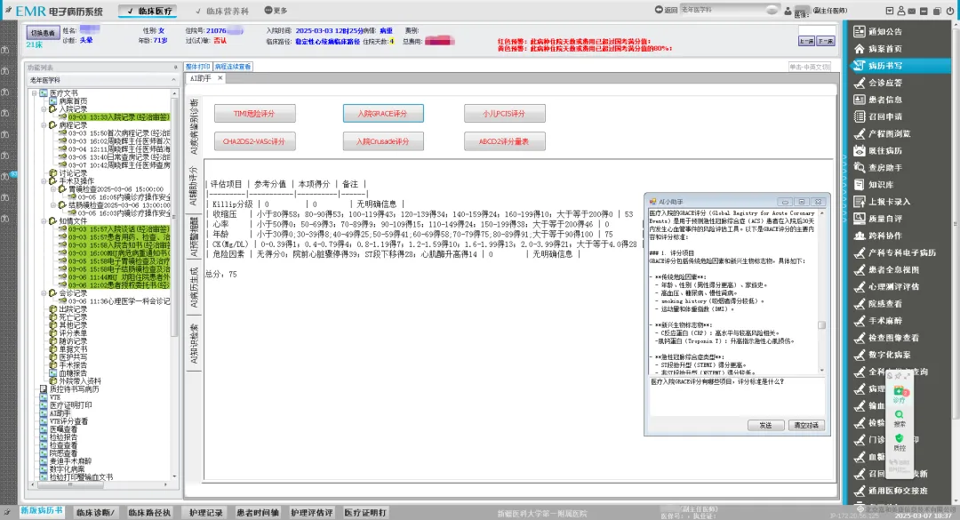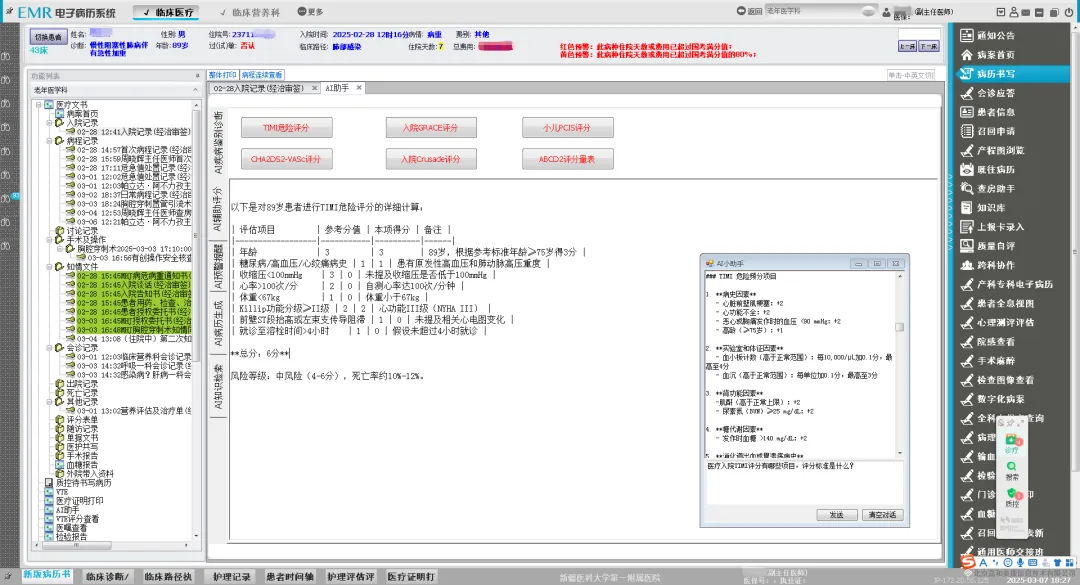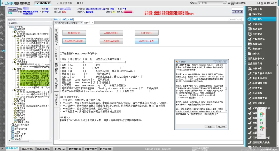 同时,该模型还能针对患者信息进行精准的医学评估,如“TIMI危险评分”“入院GRACE评分”“CHA2DS2-VASc评分”等,为临床决策提供有力依据。对于新入科的医生,医院贴心地提供了AI小助手,其基于前期收集的丰富知识库,能够为年轻医生提供专业的医学指导,帮助他们快速查询医学知识,提升业务水平,助力医院人才队伍的建设与发展。
