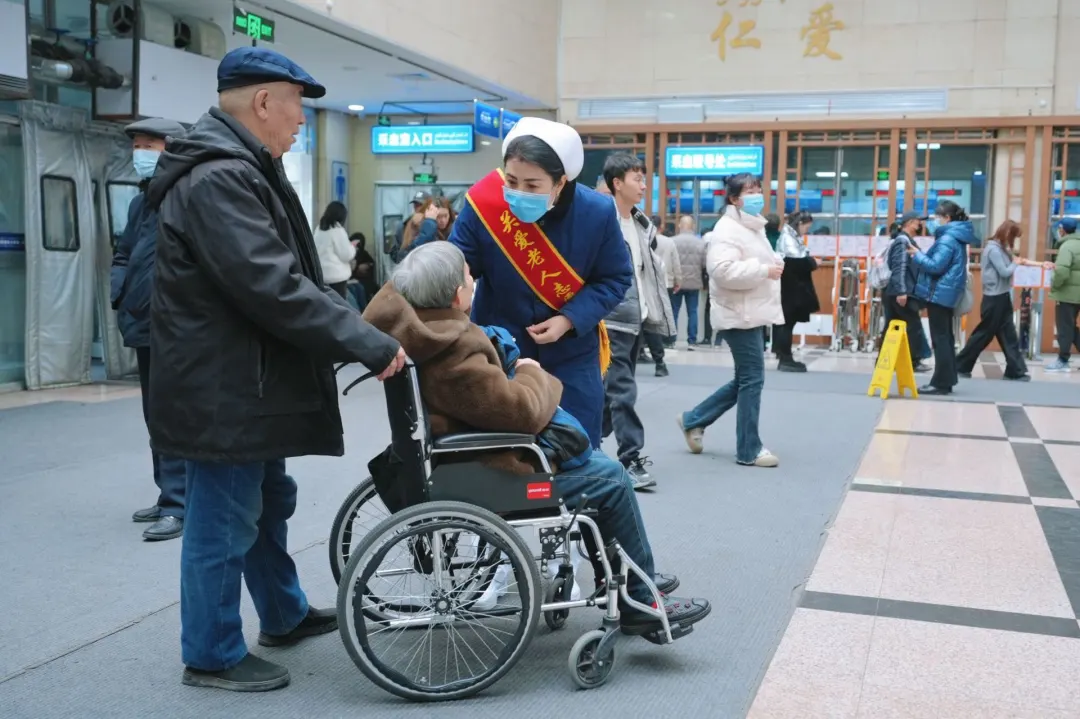 在门诊大厅,佩戴“关爱老人志愿者”绶带的志愿者是新医大一附院“向日葵助老助残服务队”的导医们,也是患者最贴心的“引路人”。他们不仅提供挂号指引、就医导诊服务,还为无陪护的老人、行动不便者提供“一对一”全程陪诊服务,从挂号到检查、从缴费到取药,全程陪伴解决难题。