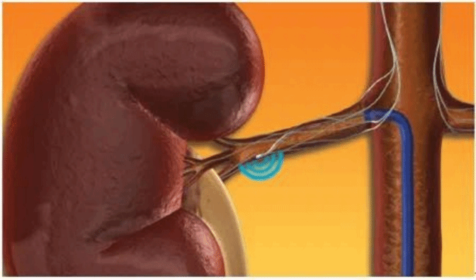 肾交感神经呈网状分布,主要集中于肾动脉外模及其周围,这为肾动脉内送入导管进行射频消融提供了可能性,从肾血管内释放能量选择性破坏肾交感及传出神经从而抑制RAAS系统激活。