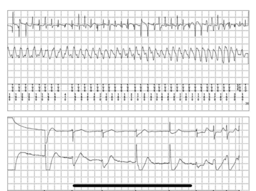 (图为患者发作恶性心律失常及放电时的心电图)