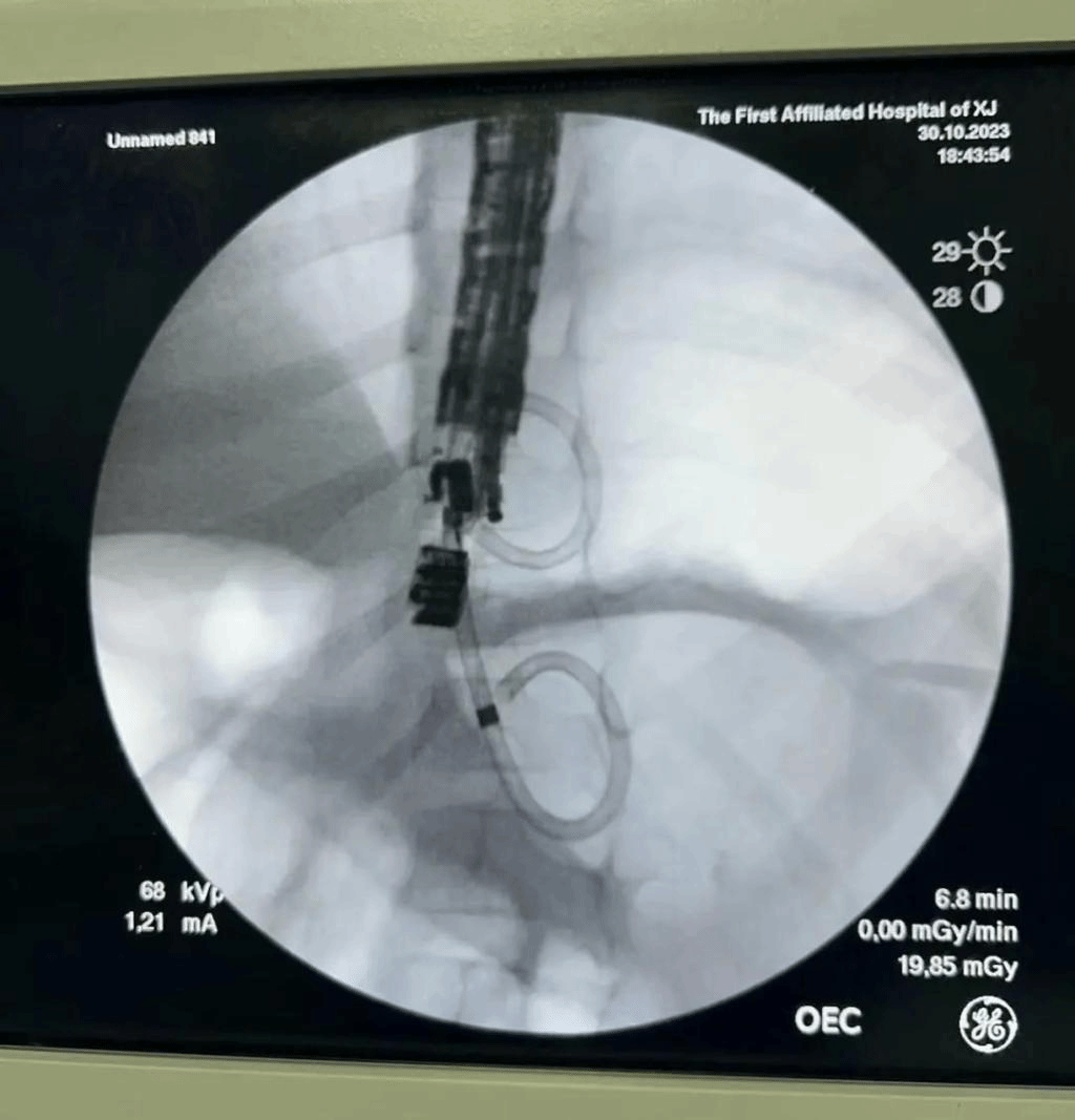 5岁的孩子不慎摔伤导致上腹部腹痛,并伴有呕吐和发热症状,经检查医生判断其为胰腺假性囊肿(截面大小约7.0cm*6.3cm)、胰管断裂可能。考虑到患儿年龄小,且囊肿已经形成完整囊壁包膜,经新医大一附院消化病中心内镜团队充分评估后,决定采取超声内镜进行探查,通过胃体部位超声检查准确定位胰腺囊肿穿刺部位,经胃壁穿刺成功后,再在X线下置入导丝,切开刀扩大穿刺口,成功置入双猪尾引流支架,见清亮囊液流出,仅30分钟便顺利完成手术。术后复查胰腺囊肿较前明显缩小,患儿无任何不适,很快康复出院。