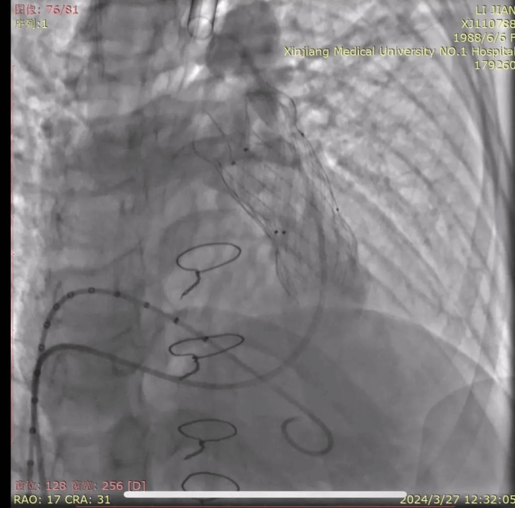 术中,马翔主任医师、刘成副主任医师联合四川大学华西医院冯沅教授实施手术,术中造影可见大量肺动脉瓣反流,沿右股静脉—下腔静脉—右心房—右心室—肺动脉送入超硬导丝建立轨道。根据测径球囊的测量,选用P30-25型号的VenusP-Valve瓣膜,至肺动脉分叉处开始释放,释放完成后重复造影可见人工瓣膜位置准确,形态良好,未见明显肺动脉瓣反流及瓣周漏。术后即刻拔除气管插管,手术成功。