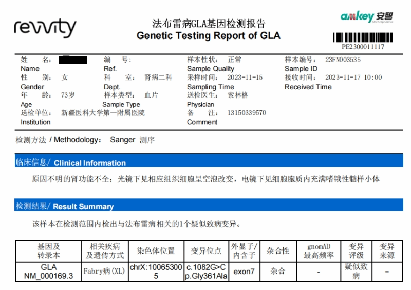 2023年7月,73岁女患者因蛋白尿、肌酐升高10天就诊入住新医大一附院肾病中心,经询问病史与家族史,患者妹妹跟弟弟均因肾脏疾病去世,儿子有临床蛋白尿,考虑遗传性疾病导致肾损害不除外。2023年11月,在中国红十字基金会项目免费资助下,患者行干血片法检测提示GLA基因7号外显子突变,进一步肾脏穿刺病理电镜显示“噬锇髓样小体”,据此患者与儿子完善了法布雷病免费基因检测。基因检测结果提示GLA基因7号外显子突变:C蛋白在DNA水平上第1082位由碱基G突变为C,P蛋白编码361号甘氨酸突变丙氨酸。母子2人基因突变位点相同,目前在进一步为患者其他近亲属完善家系筛查。