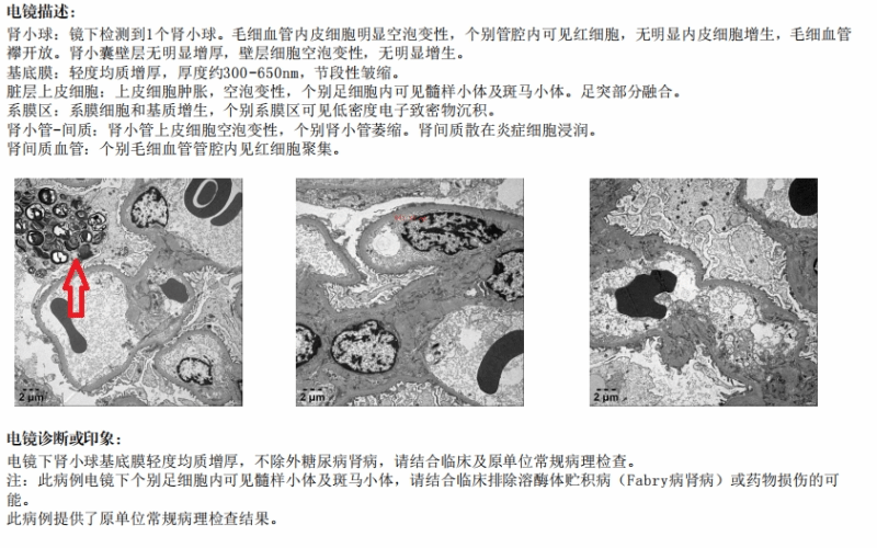 肾脏病理电镜报告(箭头处为髓样小体及斑马小体)。新疆医科大学第一附属医院供图