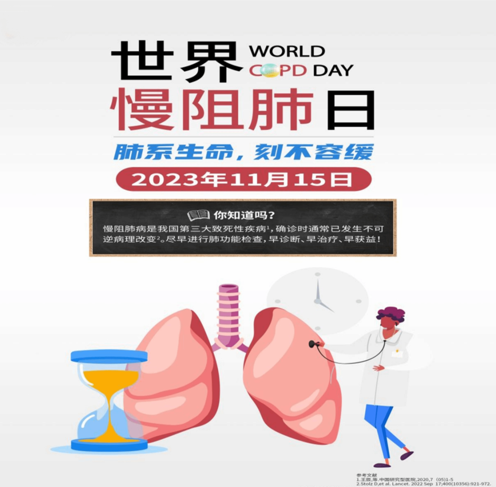 2023年11月15日是第22个“世界慢阻肺日”,今年的主题是“肺系生命,刻不容缓”,旨在强调生命早期事件对终生健康的重要性和早期诊断、早期干预的重要性。