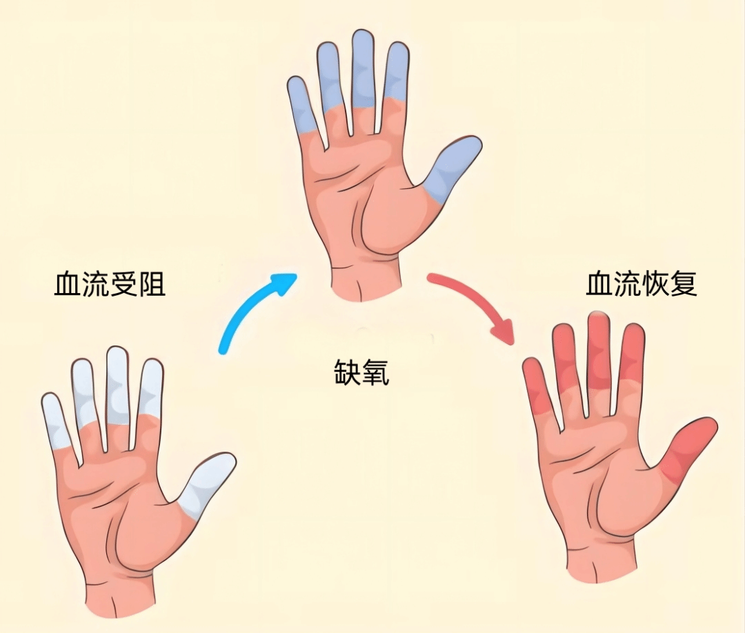 其实,这种情况在医学上被称为“雷诺综合症”或“雷诺现象”,也叫作“肢端动脉痉挛症”,因1862年医学家雷诺首先报道本病而得名。
