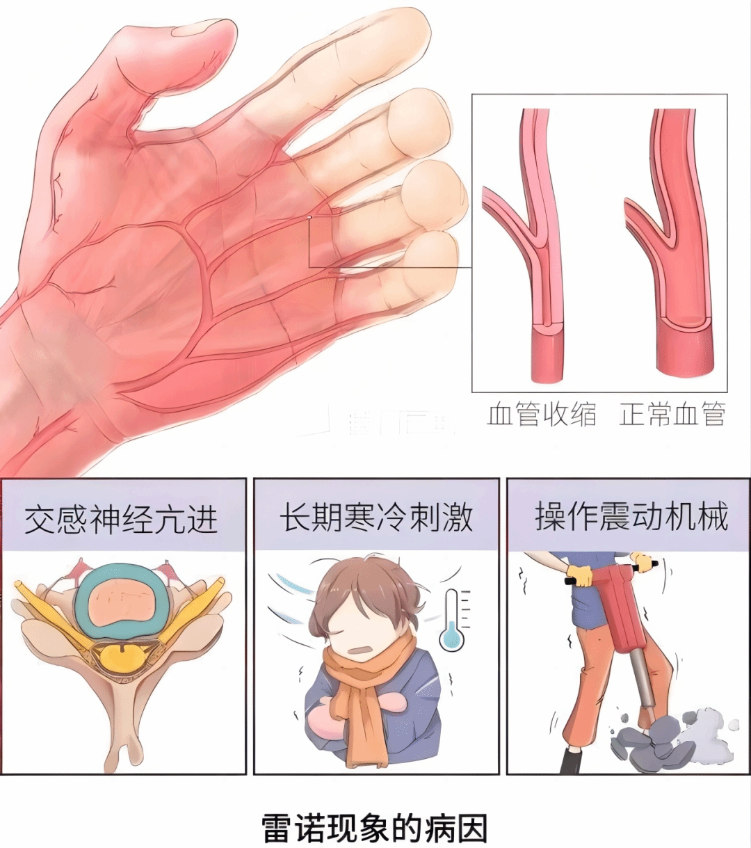 雷诺现象是由于寒冷、情绪波动、震动等因素影响引起肢端细小动脉痉挛,继以使肢端皮肤苍白、青紫而后潮红,偶伴有疼痛和感觉异常,并因温暖而逐渐恢复正常的血管功能障碍性疾病。