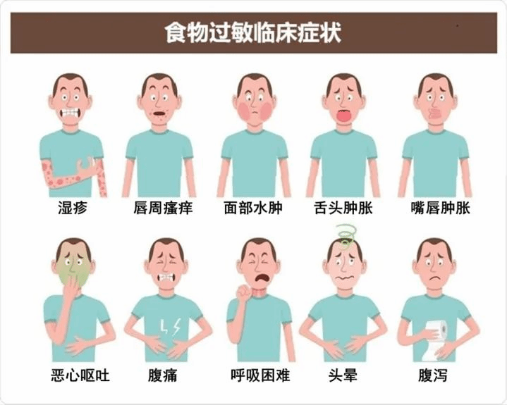 (1)皮肤系统:身上出现风团、瘙痒,诱发湿疹或湿疹加重,口唇、舌、面部、眼睑或者身体其他部位水肿。