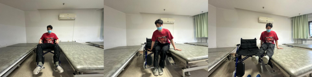 患者臀部移至床边背向轮椅→摆好轮椅后,用刹车锁好轮椅→双手放在轮椅扶手两侧→撑起上身→使臀部向后坐于轮椅内→打开手刹→将轮椅移至足跟到床沿→关闭手刹→移回脚踏板→将双足放于脚踏板上→自我调节好重心。