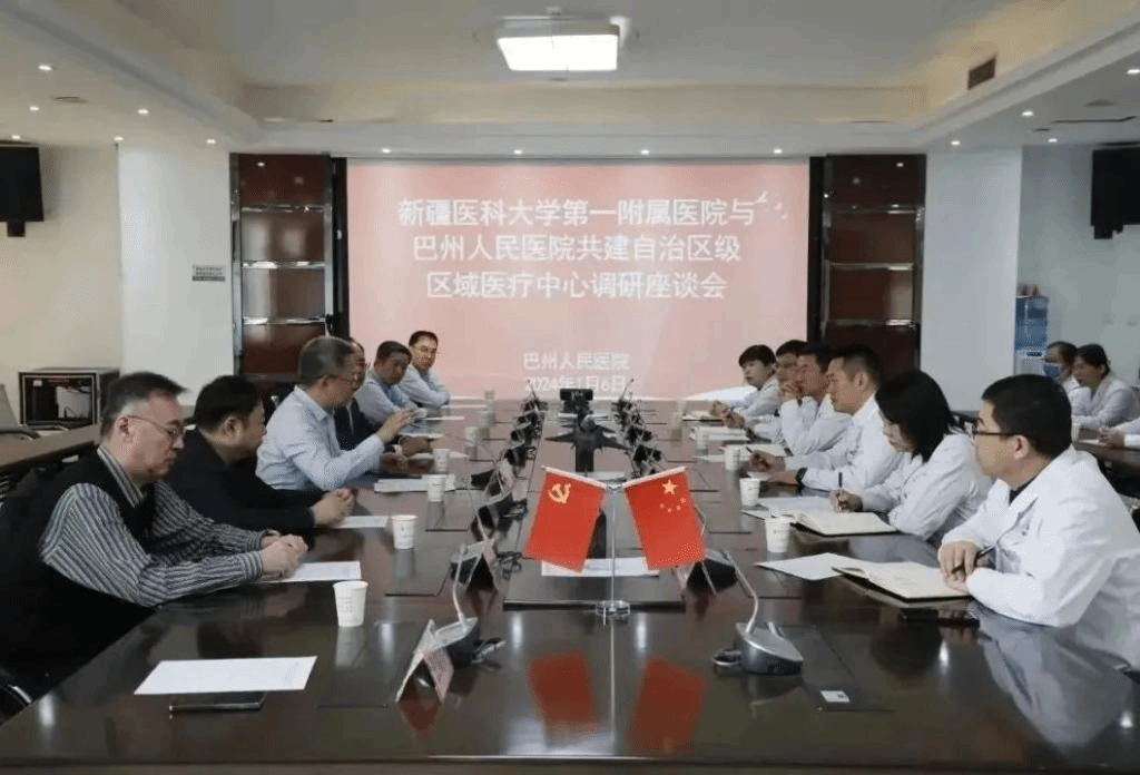 为深入贯彻落实国家及自治区关于建设区域医疗中心的决策部署,1月6日,新医大一附院党委副书记、院长陆晨,党委委员、副院长吐尔干艾力·阿吉带队部分临床科室专家共11人前往巴州人民医院,以深度合作为契机,践行“实”字当头,“干”字为先,“效”字为要,“联”字求破的理念,就共建自治区级区域医疗中心、推进合作实效开展调研交流。