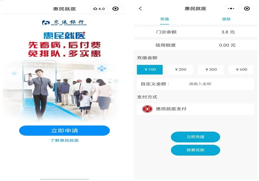 先诊疗,后付费:符合条件的医保患者可以提前申请信用额度,在门诊看病时先使用额度支付医疗费用,无需预先支付,安心就医不再有经济负担。根据患者的综合资质评估,可享受最高5000元的信用额度支持。